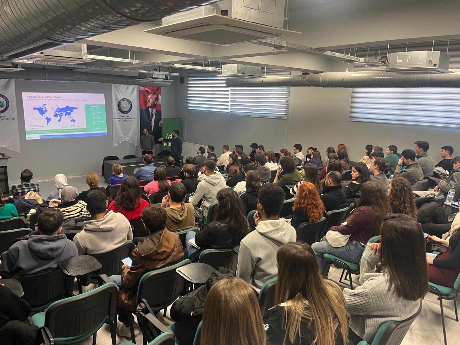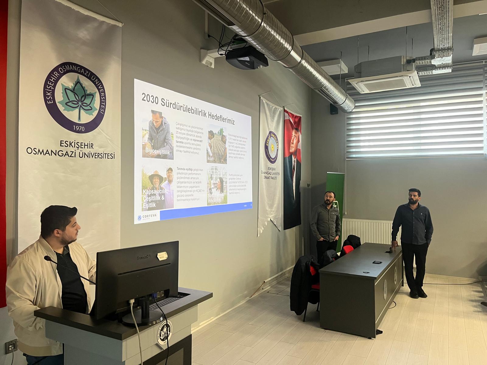 Veli Erdoğan (Afyon Bölge Sorumlusu), firmanın global ve yerel düzeydeki tanıtımını yaparak Corteva’nın vizyonu, tarım teknolojilerine katkısı ve Türkiye'deki faaliyet alanları hakkında bilgi verdi. Şirketin Ar-Ge odaklı yaklaşımı ve sürdürülebilir tarım uygulamalarına olan katkısı öğrenciler tarafından ilgiyle karşılandı.